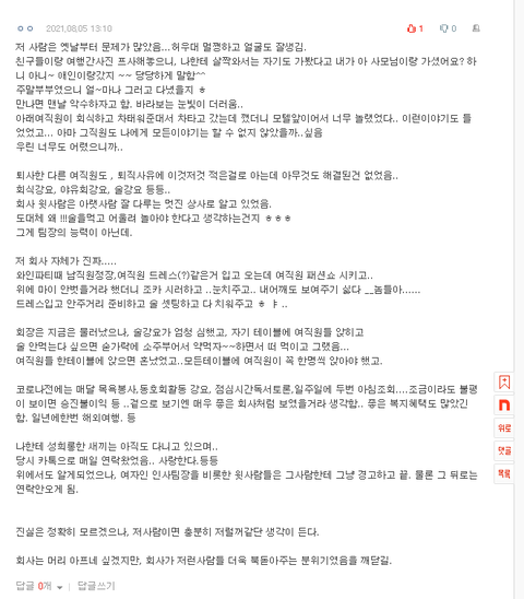(한 여직원은 결혼 전 본인에게 결혼할 남자친구 인사 안 시켰다며 괴롭혔고 그런 일들이 쌓여 그 여직원은 퇴사했다고 남편에게 들었습니다)