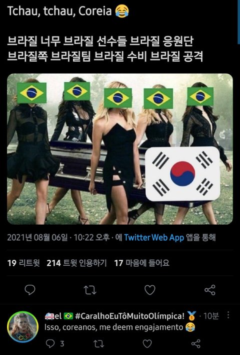 4. 굳이굳이 우리나라 트위터로 넘어와서 조롱하는 브라질 국민 수준 원숭이보다도 못함 + 김수지 선수 얼굴 맞은 거 계속 올리면서 조롱 + 우리나라 조롱할 때 계속 아버지 들먹이는데 진짜 아버지가 없는 건 누구 쪽인지 의심 됨