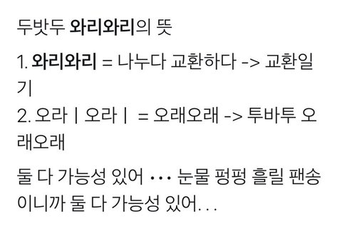 그거 모아 ㅋㅋㅋㅠㅠㅠ 진짜 개웃겨 개어이없어 수록곡 제목이 교환일기(두밧두 와리와리) 임ㅋㅋㅋ큐ㅠㅠㅠ 투바투를 왜 투바투라 부르지 못하고ㅋㅋㅋㅋㅠㅠㅠㅠ 아 죽겠다 아 너무 웃겨 미치겠네 진짜