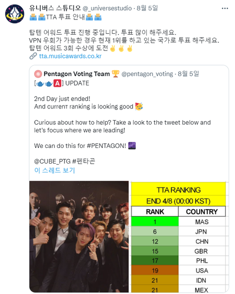 - VPN 말레이시아로 우회한다 - TTA 사이트 접속 - 로그인한 후 개인정보( 오른쪽 상단 v) 에서 복사했던 코드번호 붙여넣어서 TTA용 투표권을 얻는다 - 펜타곤 투표한다 끝