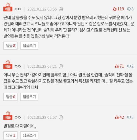 품종묘 품종견 키우는게 왜? 저사람들이 키우고 싶어서 키우는거고 그렇다고 학대 유기를 한것도 아니고 자기들 돈들여서 키우고 관리하고 있는데 그게 왜 문제야? 오히려 일반사람들이 학대하고 유기시키는게 더 문제아니야? 유기견 입양하는거 당연히 그게 좋지만 어뜬 품종을 키우던 그건 키우는사람 맘이고 그걸로 다른사람이 터치할부분은 아니라고봐.. 연예인 품종묘 품종견 키운다고 뭐라 할시간에 학대하고 유기하는 사람들이나 뭐라고해