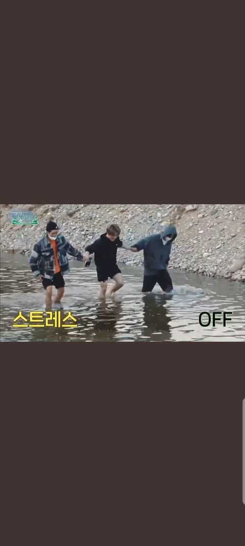 오른쪽 윤정한만 포기하고 긴바지 그 상태로 계곡 건너는 중임 진심 너무 웃김 차니는 반바지지만 워누는 안 젖기 위해 다 걷고...