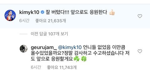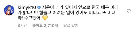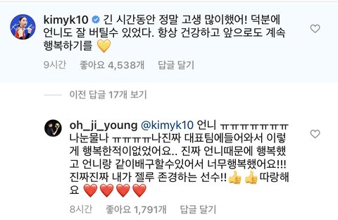 댓글 열려있는 후배들 하나하나 댓글 달아주는 김연경 끝까지 너무 따뜻해..김연경 성격으로는 댓글 못 달아준 후배들까지 꼭 안아줬을 듯..ㅠㅠㅠㅠ