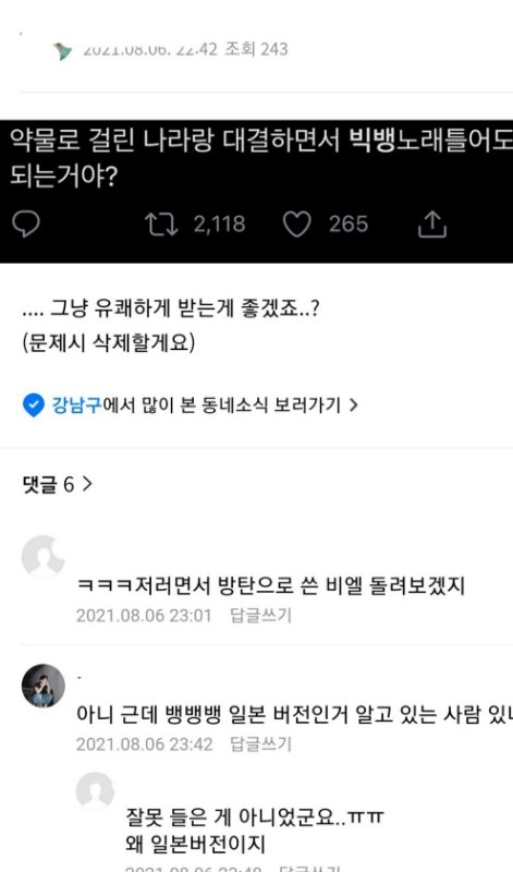 저 트위터 방탄팬이 올린 것도 아닌데 빅뱅 까이니까 뜬금 방탄 언급 하는데 타돌 언급 해도 말리는 팬도 없음