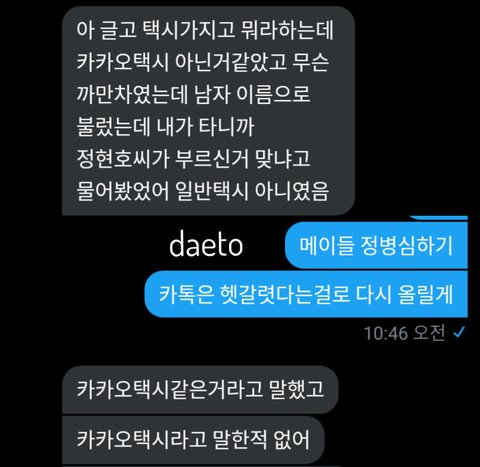 전여친이라는 사람이 카카오택시를 불렀는데 정현호씨 맞냐고 기사가 물어봤다함