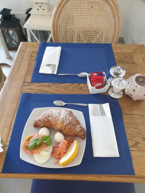 바다가 깔린 풍경에 파랗고 노란 색감들로 가득한 영화같은 곳에서 생모짜렐라, 토마토에 크루와상을 먹으면 진심 내가 주인공이 된 기분이 물씬남. 특히 저 크루와상은 버터리한 풍미가 진짜 나폴레옹 크루와상이랑 버금가는 맛이었음!!