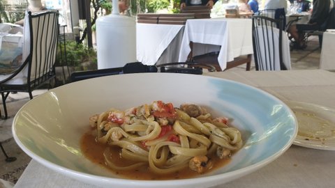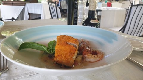 생선 스테이크랑 해산물 파스타 메뉴를 하나씩 시켰는데 이탈리아에서는 메인디쉬로 1인 1메뉴는 무조건 시켜야 되고 나눠먹는거 싫어한다고 하더라...스타터랑 디저트 안시키는거 좀 눈치보임ㅠ 대구살 스테이크로 추정되는 스테이크는 겉면을 튀겨서 겉바속촉의 식감이 매우 좋았음. 생면 파스타도 그럭저럭 맛잇었는데 막 맛의 경지에 오른 그런 맛인지는 모르겠는?