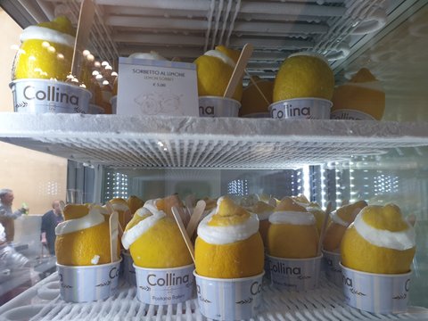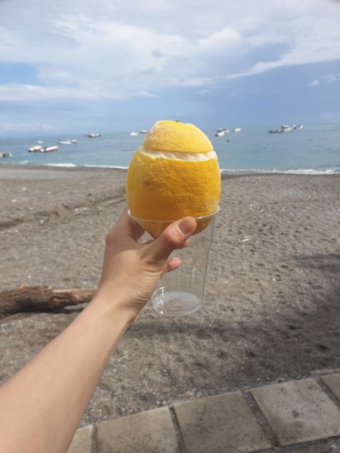 레몬이 유명한 포지타노는 길거리음식으로 레몬아이스크림과 레몬셔벗을 많이 팜. 근데 아이스크림은 쏘쏘. 셔벗은 농도100% 진한 레몬의 맛을 느낄 수 있는 매우 요물인 디저트다. 찐한 레몬과실맛에 달콤함까지 한도초과...