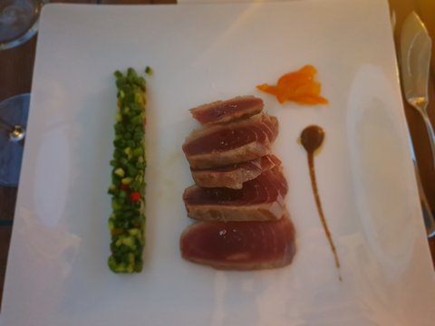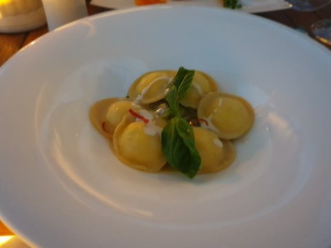 스타터로는 작은 바게트에 토마토가 얹어진 깔끔하고 신선한 맛의 요리가 입맛을 돋구고, 뒤이어 메인디쉬로 참치타다끼스러운 요리가 나왔다. 부드럽고 찰진 식감과 저 쪽파?가니쉬가 진짜 잘어울렸음. 이탈리아 와서 맛들인 라비올리가 다음 메인디쉬로 나옴. 짠 음식만 먹다가 부드럽고 간이 딱 적당한 라비올리를 먹으니 맛의 상승효과가... 진짜 이때 먹은 라비올리가 세젤맛이었음.