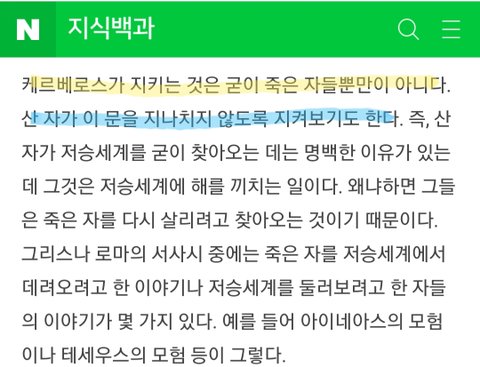 '케르베로스가 지키는 것은 굳이 죽은 자들뿐만이 아니다. 산 자가 이 문을 지나치지 않도록 지켜보기도 한다. 즉, 산 자가 저승세계를 굳이 찾아오는 데는 명백한 이유가 있는데 그것은 저승세계에 해를 끼치는 일이다. 왜냐하면 그들은 죽은 자를 다시 살리려고 찾아오는 것이기 때문이다.'