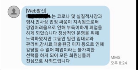 저한테는 문자가 안와서 처음엔 당황스러웠어요. 왜냐면 8월 7일 토요일까지 영업을 했고, 그때까지 신규회원등록을 했었거든 8월 8일 일요일 (휴관일) 밤 8시 30분경 이 문자를 받고,