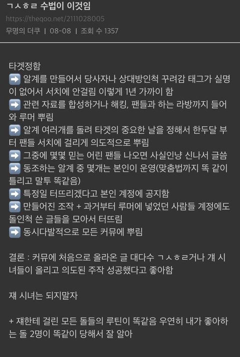디시 남연갤에서 악플러 네임드로 유명하며 각종 아이돌들의 루머 퍼트리며 다니는 악질임