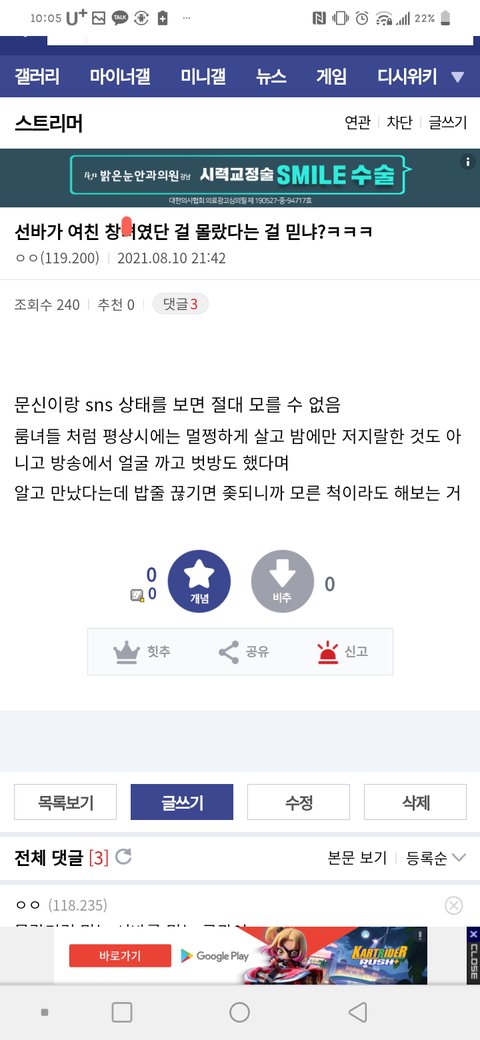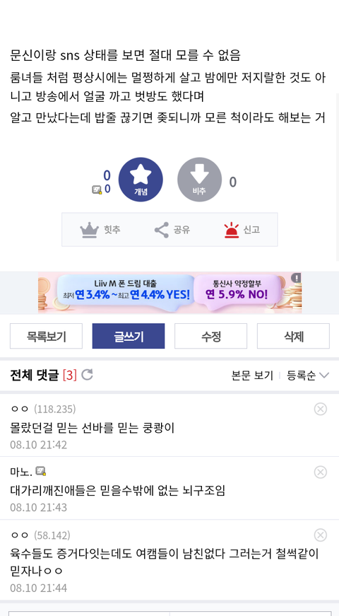 남자가 말 같지도 않은 소리 하는데 그저 남자가 하는 말이라고 아 그렇긴 해! ㅎㅎ 무지성 ㅂㅅ 맞장구 시전하는 거 볼 때마다 특히나 죽..