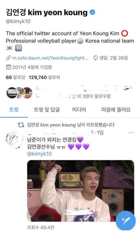 김연경 선수님 찐 트윗 계정인데 남준이가 온라인 팬싸에서