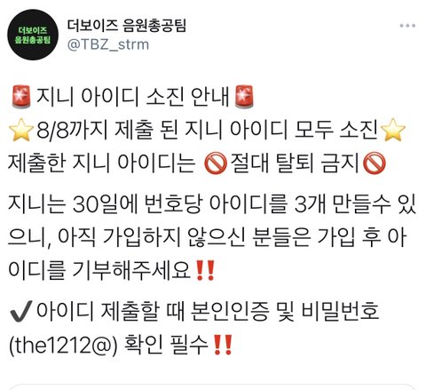 30일 전에 아이디 만들었으면 새로 3개 만들어서 총공팀에 보내줘! 이건 탈다 안되니까 기존 아이디 탈퇴할 필요 없어 그리고 가좍들 이용해서 많이많이 만들어서 보내자ㅠ 우리 안그래도 지니 약한데 큰일이다잉..