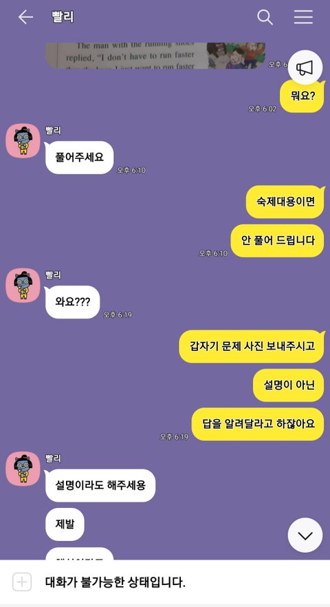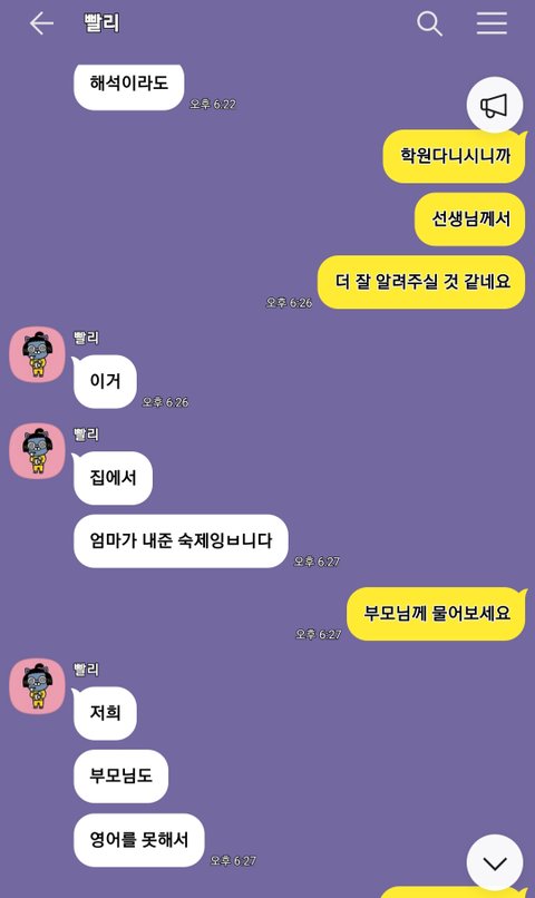 오늘 말투로 보아 초등학생이라 짐작되는 한 학생이 들어와 문제집 사진을 주었습니다. 그 후 아무 말이 없고, 답만 알려달라고 하길래 저의 오픈채팅방의 취지와는 맞지 않으므로 숙제를 내주신 부모님께 여쭈어 보는 건 어떠냐고 추천했습니다.