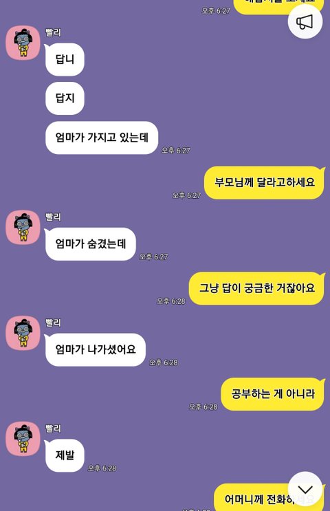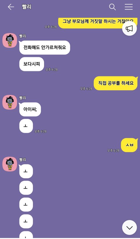 그 후로 계속 부모님이 답지를 숨겨놓고 나가셨다면서 알려달라고 하길래 안 된다고 말했습니다. 그 때부터 욕을 엄청 보내더니 방을 나가더라고요.. 욕 하는 중간에 저도 잘못했지만 욕의 초성인 ㅅ*을 보냈습니다ㅠㅜ