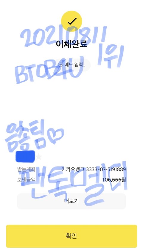 대딩이고 이번달에 알바를 시작해서 엄청 큰 금액은 아니지만ㅜㅜ 참여했다는 것 자체로도 뿌듯하고 기분이 좋네요ㅎㅎ 당분간 몇 백원이라도 더 모이면 조금씩이라도 보내보려고용! 비투비 꼭 1위 길만 걷자❤️