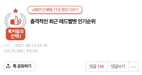 다 게시물 올라온지 1분 차이로 달린 댓글들이 연이어서 베플 되고 추천수도 똑같음 베플 되면 뉴 베플에 떠서 유입 많아지고 조회수 쌓여서 결국 톡선가는 원리 알고 저러는 것 같음 이렇게 다니면 팬들이 아무리 먹금해도 베플 박아서 유입 생기게 하기+저렇게 베플 주작질 할 수 있는 머릿수/계정수면 충분히 댓글 여러개 쓰고 다중이짓에 추천 반대 조작 가능한데 톡선 엉망진창 되는거 순식간일듯