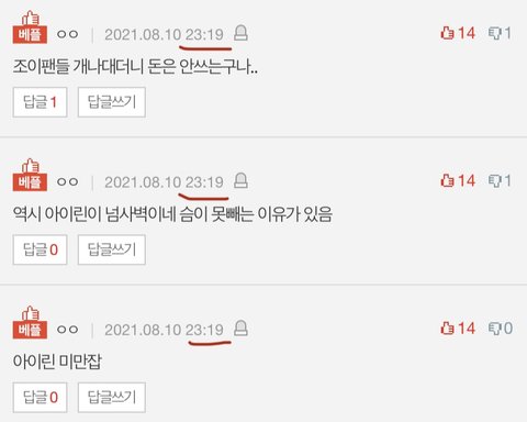 베플 세개다 11시 19분 1분차로 쓰여진데다가 추천수 14로 동일
