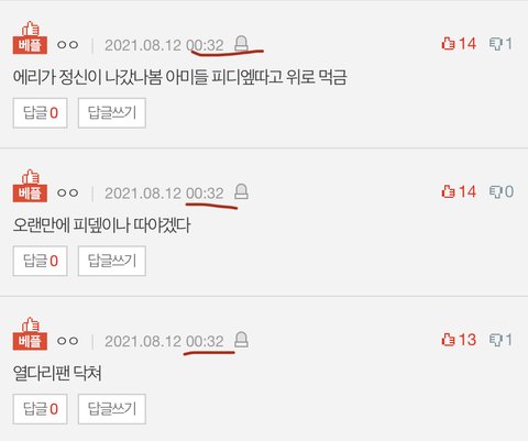 베플 세개 다 12시 32분 1분차로 올라옴 추천수도 13~14로 동일