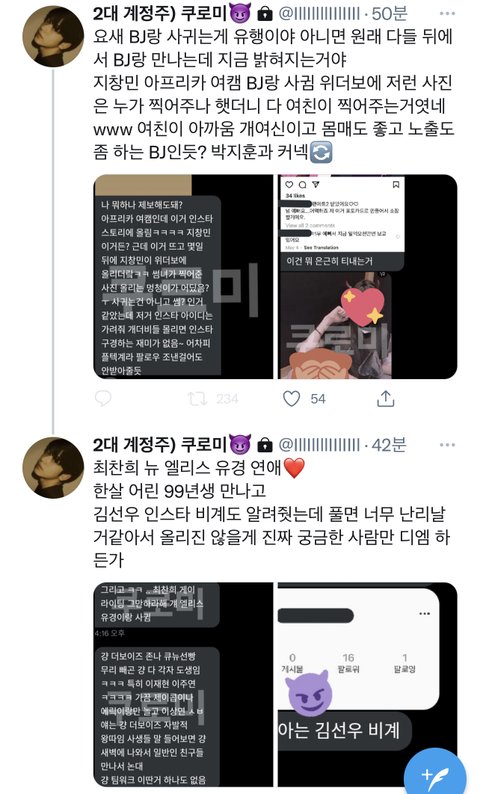 제니 카리나 주어만 바꾸는 걔가 엔터판 분탕 원인임 걔가 리사 로제 윈터 다 돌려까고 댓글에 홍은채 선글라스짤로 시작해서 릇 슴퀴 트와..