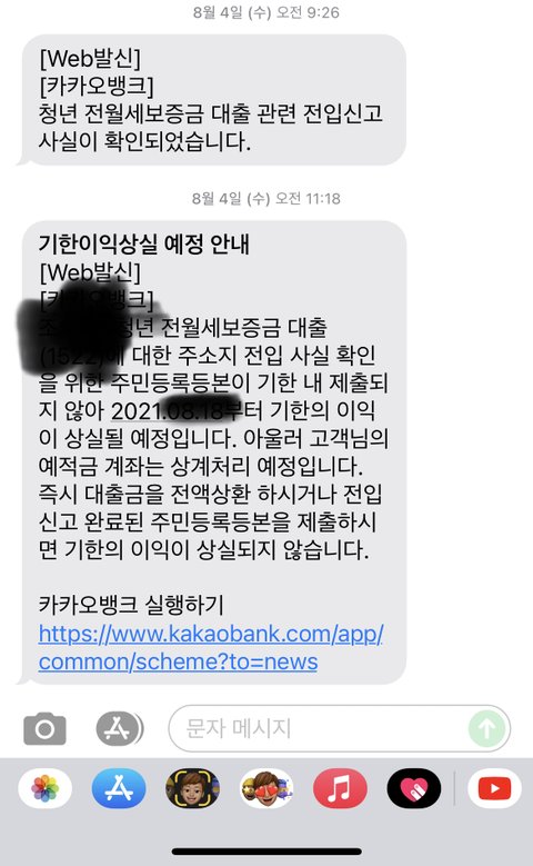 3. 카카오뱅크 전세자금대출 받고 한달이 지난시점에 갑작스럽게 저런 문자 (사진참고) 를 받았고 너무 놀라 업무도중에 뛰쳐나가 고객센터에 전화를 했습니다. 상담사는 "전산조회결과 대출서류에 문제가 없는것으로 보이는데 왜 그런문자가 발송된것인지 확인해보겠다"했고, 어렵게 연락이 닿은 다른 담당 직원은 "뭔가 착오가 있었던것 같다. 현재 대출관련하여 '아무런 문제'가 없으니 잘못받은 해당문자는 지워달라"고 했습니다