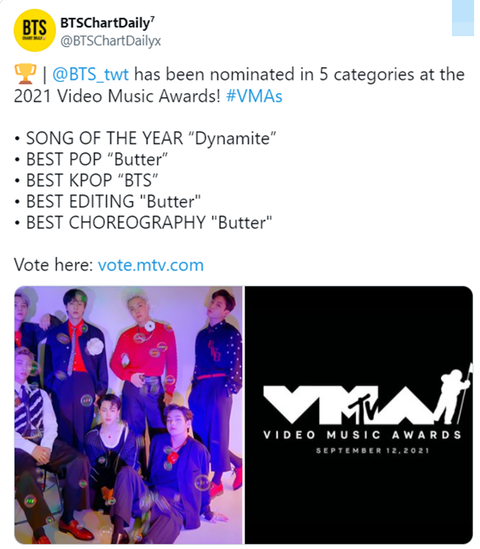 2021 VMAs 5개 부문 노미네이트된 방탄소년단