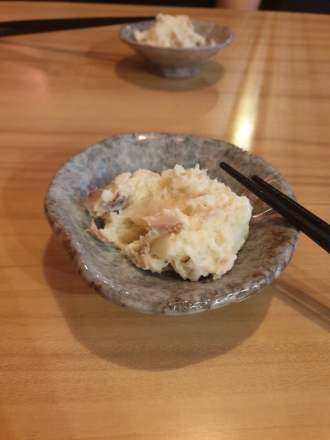 기본찬? 술집에 가면 기본으로 주는 메뉴인데 이거도 나중에 돈받음. 여튼 감자 사라다. 흔히 술집에서 주는 메뉴인데 부드럽고 매우 맛있다.