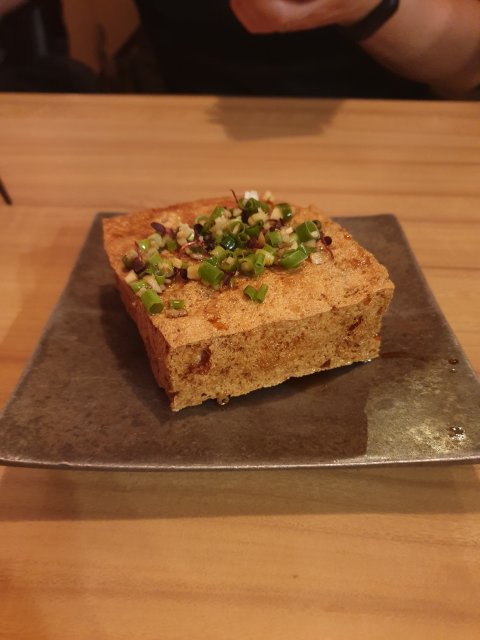 아게도후?? 튀긴 두부요리인데 겉면 식감이 쫀득하고 단단한 유부같음, 속 안은 부드러워서 먹는 재미가 있음. 역시 쯔유베이스의 달짝지근하면서 짭조름한 맛이 사케를 부름.