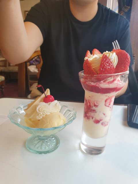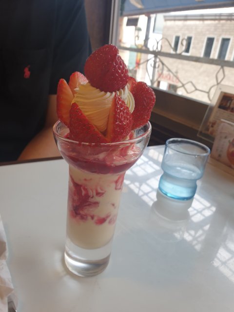 모양은 매우 예쁘다. 아이스크림은 약간 살짝 서걱거리는 맛이 옛날에 먹던 바닐라 아이스크림 맛이었음. 딸기 베이스가 맛이 없을 수가 있나.. 그치만 굳이 가서 사먹을 정도는 아니었던 메뉴.