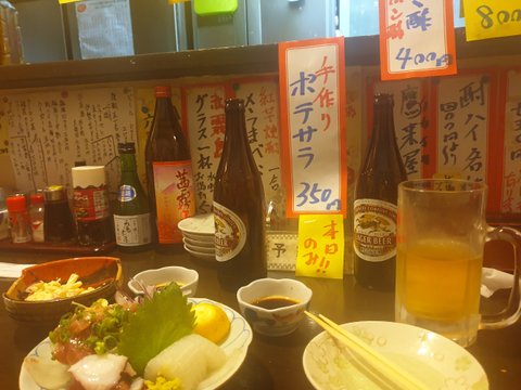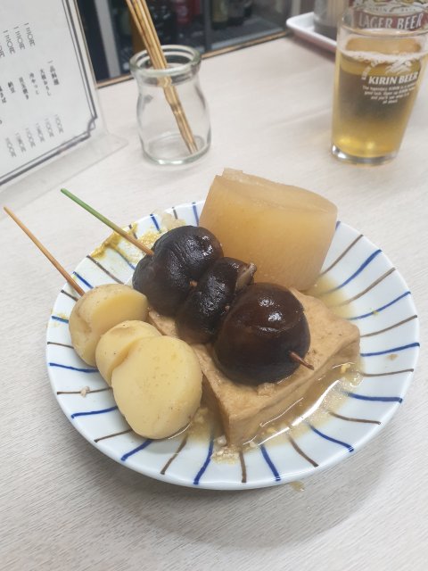 작은 가게에 술을 마시는 사람이 잔뜩이라 거의 만석이었다. 오뎅 종류별로 선택해서 하나씩 먹는 재미가 있음. 사케 잔술로 시켜놓고 홀짝이다가 안되겠다 싶어서 병맥도 주문.