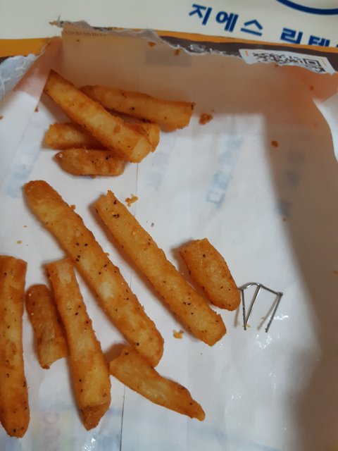 어제 오후 19시40분경 ㅁ사 버거를 시켰는데 맛있게 먹다가 감자튀김에서 철 조각을 발견하고 깜짝 놀랬어요. 감자튀김에 붙어있어서 아무 생각 없이 먹다가 미처 발견 못했으면 철 조각을 삼킬뻔했어요. 해당 매장에 가서 말씀을 드리니 저희 매장에는 그런게 나올리가 없다고 하더라구요. 그러면서 점주분이 환불해주시고는 직접 본사에 건의하시겠다고 하시더라구요? 그래도 못 미더워서 고객센터에 전화를 했는데 담당자분께서 사진을 확인하고 연락준다고 하셨는데 사진을 보냈는지 한참 됐는데 연락이 없네요^^ 매장측에서 책임을 회피하는 게 어이가 없어서 이렇게 글을 올립니다.