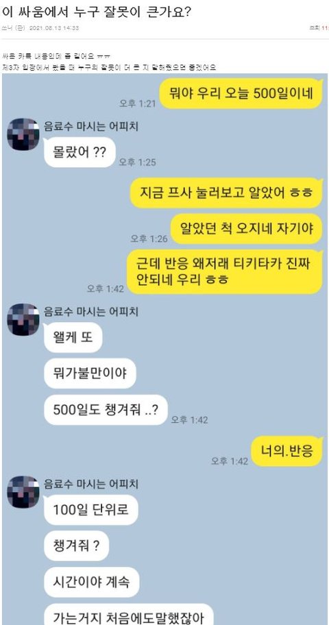 여자가 선시비튼건 맞는데, 평소 남자쪽 성격이나 말투도 보임. 여자가 500일이네?라고 한걸보면 애초에 남자도 500일이라고 언질이 따로 없었음. 그럼 500일인걸 알고도 걍 말없이 있었거나 몰랐다는 두가지 경우가 되는데, 알았으면 어 맞아 나도 아까 봤는데 500일이더라 가 일반적이고, 몰랐어도 아 진짜??그러네 우리 500일이었구나 가 정상임ㅇㅇ 남자 말투로 보니 평소에도 딱히 아는것도 아닌데 뭔가를 묻거나 얘기하는 상대에게 그것도 몰랐어? 너가 그렇지 식의 쓸데없는 남탓이나 꼽주기가 일상이었을듯ㅇㅇ몰랐으면서 정보고 제공되니까 오히려 난 원래 알고있었는데 넌 그걸 이제서야?하듯 몰랐어??하는게 비슷한 상황이 쌓여온 여자한텐 이새끼 또 시작이네 시비거네로 보일 수 있다고 봄.