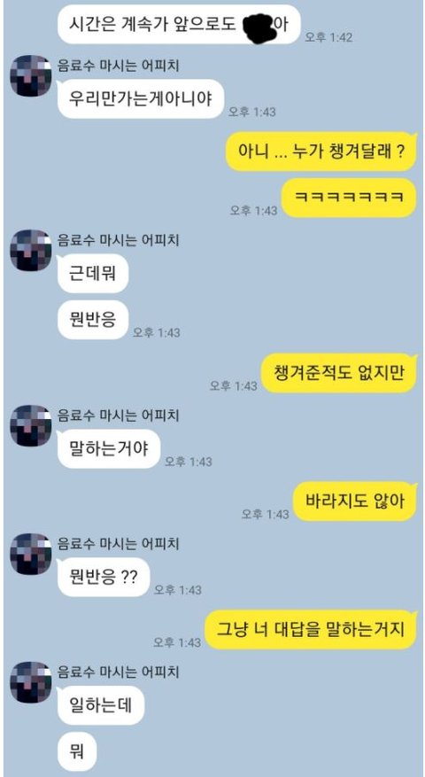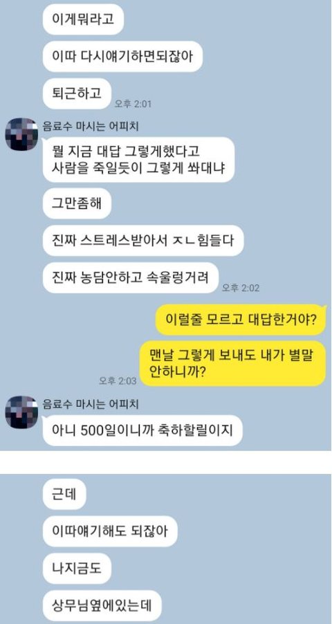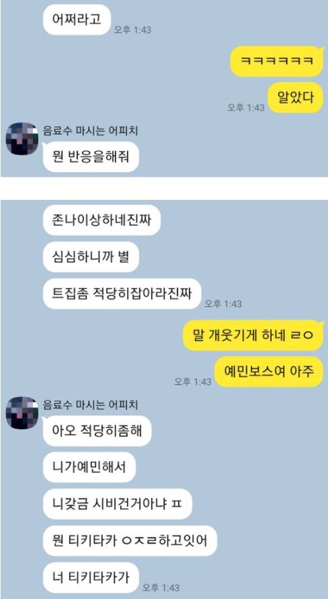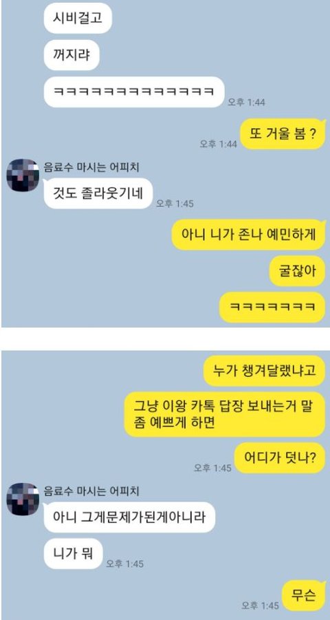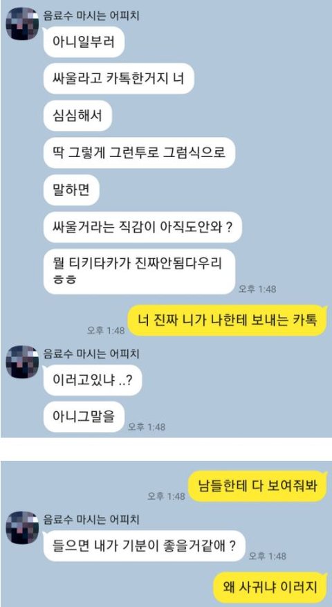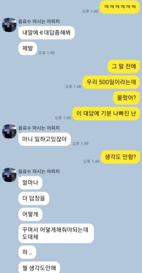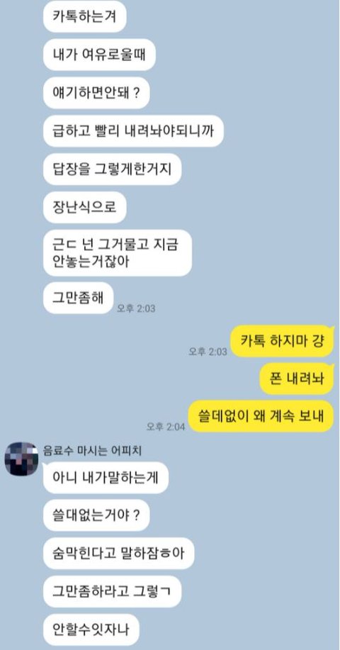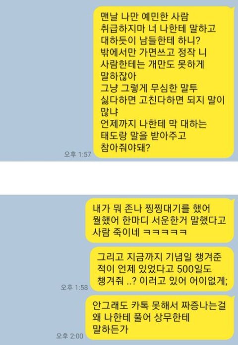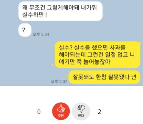 나도 남자가 더 잘못했다 느꼈는디 반대가 많군요ㅋ 지가 바쁘면 이따 톡한다하고 쌩까믄되지 온갖 짜증다내는거 보소. 원래 장난스런 스탈같지도 않은데 몰랐어?란 답변자체가 시비아닌교? 먼말을 해도 저딴 대답나오면 대화가 될라나 멀보는 사람짜증나게 이런걸 올려서는.. 헤어져 그냥. 니네 안맞어 성격들 고치고.