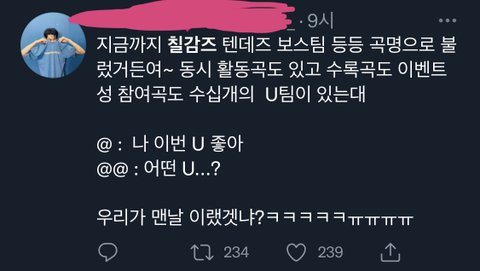 머리가 그렇게 안 돌아가나 짹에서 칠감즈 쳤을 때 엔하이픈만 ㅈㄴ 뜨고 엔시티 2개 밖에 안 떴다 지들은 화낼 사람이 300명 밖에 없다 이딴 쌉소리로 우기던데 만약에 아미나 엔시티즌들이 방탄, 엔시티 멤버 두 명이 오디션에서 타가수 곡 부른 거고 그 멤버들 뫄뫄(노래제목)즈 이렇게 불렀으면 톡선에 올라가는 건 기본이고 추천 수 1000 넘어서 개처맞고 있을 듯