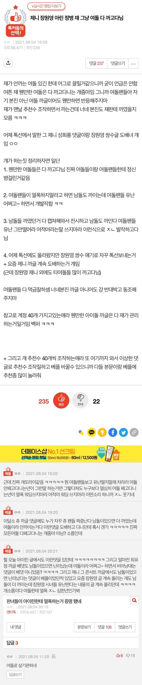 미리 추반) 여돌 정병 또왔다~ 얘 일부러 에스파 팬인척 맨날 블핑 레드벨벳 소녀시대 등등 다 패고다니는 정병임 그리고 지금처럼 추천수 조작으로 맨날 저렇게 여론 조작질하고 여돌판 정치질함 장원영한테도 열폭하다가 걸리고 이번엔 에스파한테 붙어서 타여돌 패는글 올리고 여론조작하는 정병 줌마야 다들 먹금해~ 베플이랑 본문 추천수 다 조작이니까 무시 ㄱ