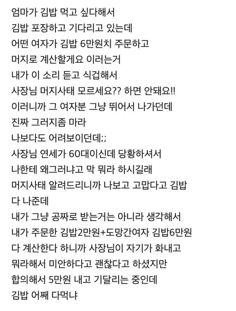 6만원 시켰다는거에서 인류애 상실했는데 결제 막고 다시 자기가 결제한다는거에서 또 살만하다고 느낌; 진짜 이상한 사람 많다