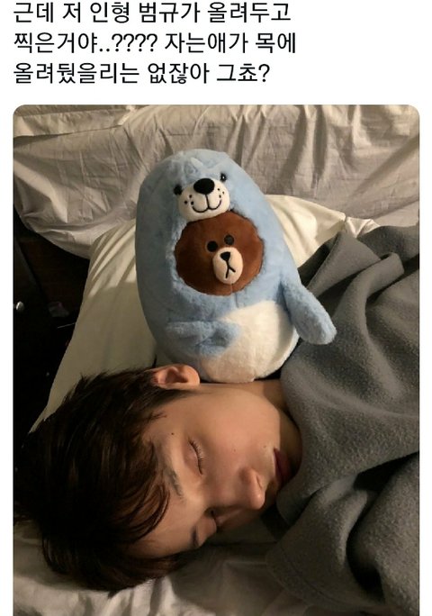 자는 휴닝이 옆에서 슬쩍 인형 올려놓코 뿌듯해하며 사진찍는 범규 생각하기.........