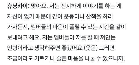 멤버들한테 카이가 잘 때 안고 자는 인형처럼 생각해주면 좋겠어요 라고 한 그거 보고 눈물 흘리고 유튜브, 트위터에 애들 관계성 보니까 맘이 따수워서 쌈디 됨ㅠㅠㅠㅠㅠㅠ 진짜 누구보다 서로를 아끼는 아이들이야...