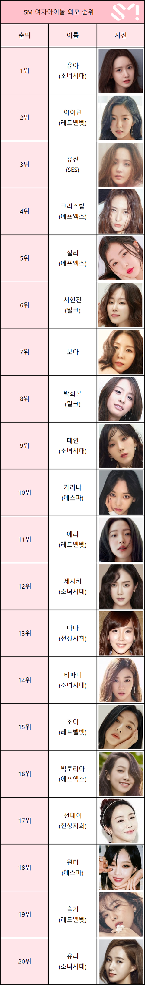 리즈시절 기준 SM 여자아이돌 외모순위 TOP 20