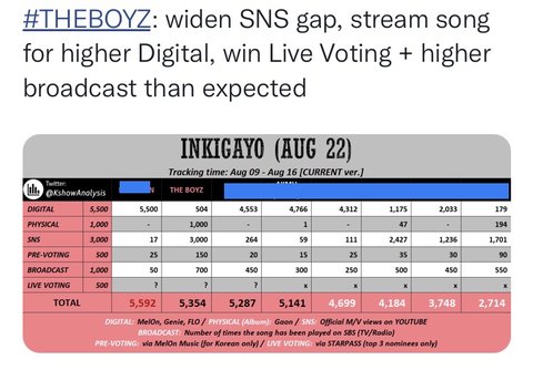 뮤비 점수 1등 못하면 그냥 인기가요 1위 기회 조차 박탈임.. 그 돌아다니는 예상표는 우리가 인기가요 뮤비 점수 1등이라는 가정하에 만들어진 거라 그것마저 뺏기면 그냥 의미없어지는거야 ㅠㅠ 지금 ㅅㅁ님이랑 200만 차이밖에 안나니까 격차 벌려야 해. 무서운 속도로 따라잡히고 있어. 이거 다음주 월요일까지 유지해야되는데 이 속도면 백퍼 따라잡힘…. ㅠㅠ