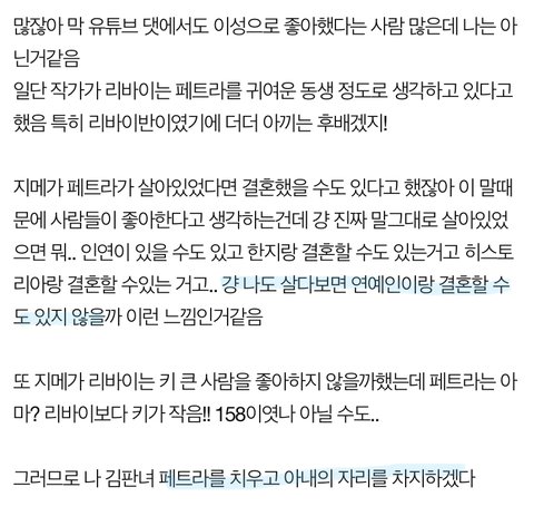 ㅆㅂㅋㅋㅋㅋㅋㅋㅋㅋㅋ 현실은...너는 연예인 만나도 그 연예인은 너 1분 있다가 잊어버리고... 결혼은 니 망상이고...페트라 치운다고 해서 너가 리바이 아내 확정인거 아니고....웃기네....