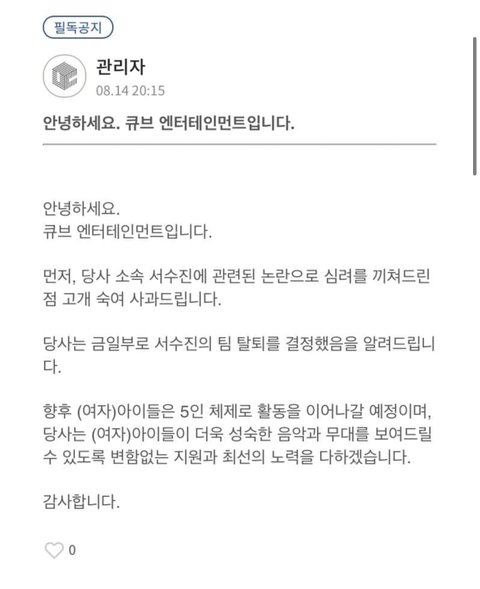솔직히 저게 끝은 시 발 좀 너무한 거 아니냐 ㅈㄴ 질질 끌어놓고 팬들 계속 기다리게 해놓고선 몇달만에 띡 탈퇴한다고만 말하면 기다린 팬들은 뭐가 되는거임