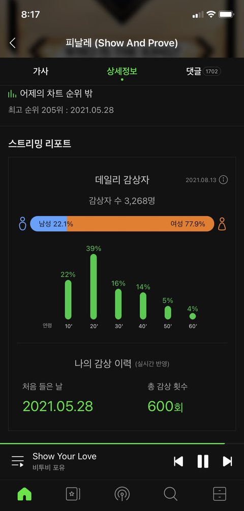 스밍기간 아니지만 ㅋㄷ 유입이라 간간이 계속 스밍하고 있는데 오늘 딱 600 찍어서 올려봐요! 희희 새 음원은 더 열심히 돌리려고요 아자아자!!