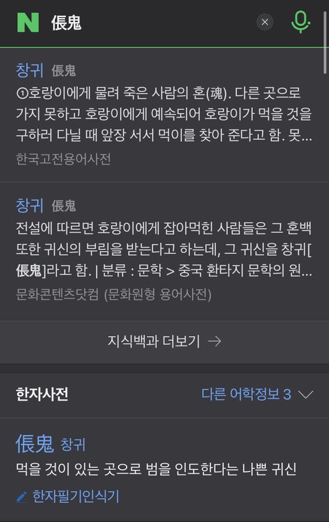 창귀가 호랑이에게 물려죽은 사람의 혼이라는 뜻도 있는데