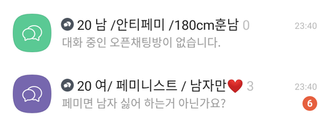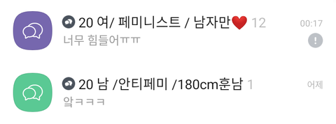 + 어제 밤 12시 20분에 옾챗 삭제함. 남자쪽에 한명 온거랑 여자쪽 3명은 판애들이글보고 보낸거고 나머진 싹~다 여자랑 대화해보려고 노력하는 찌질이들이였음. 페미가 싫다면서 페미 여자랑 굳이 대화할려는 ㅅㄲ도 있고 페미니즘 지지한다면서 오조오억이 혐오단어라는 애도 있음