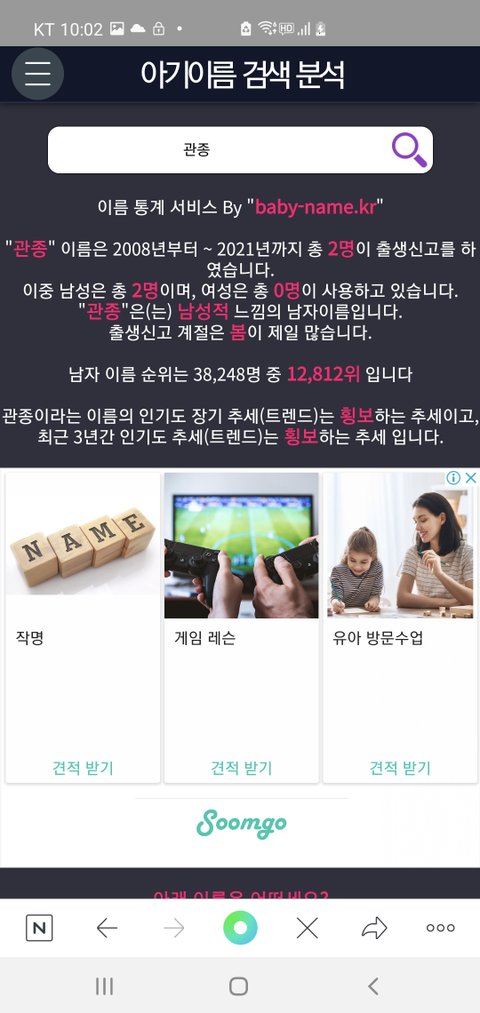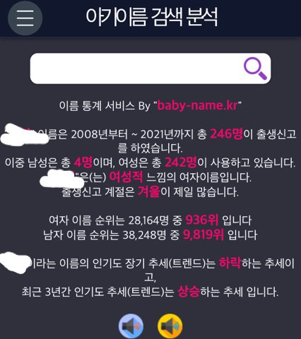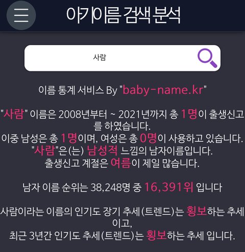 네이버에 아기 이름 분석이라 쳐보고 성빼고 자기 이름 입력해봐 2008년부터 지금까지 몇명태어났는지 나옴 난 너무적다 ㅜ