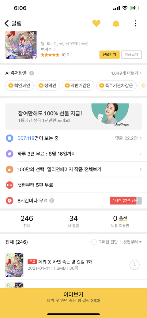 얼마남았나 보려고 들어갔는데 1시간 27분