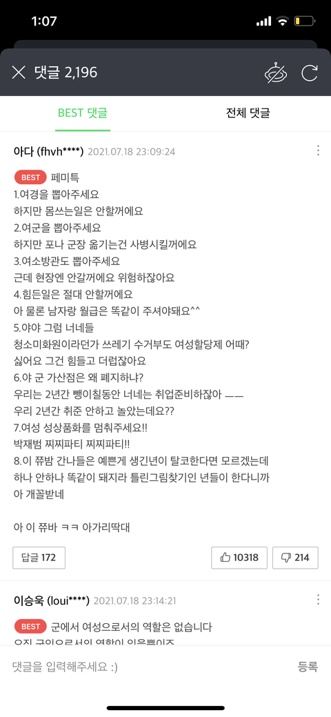 5. 군가산점 사실 이건 뭐가지고 문제를 들먹거리는지 모르겠음 남자들이 제일 젊고 좋을 시절 2년을 나라 부름 받고 끌려가서 고생하는 건 맞지 않음..? 뭐가 문제라는건지 모르겠음 사실 저기 댓글에는 페미들은 지네는 취업준비 안하고 노네 어쩌네 하는데...;; 어쩌라는건지 잘 모르겠음. 지들이 취준안하고 논걸 왜 남자탓하지
